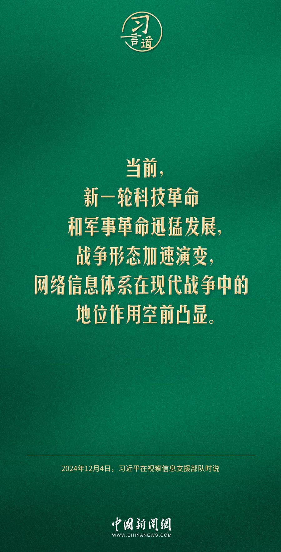 中共中央總書記、國家主席、中央軍委主席習(xí)近平4日視察信息支援部隊,代表黨中央和中央軍委,對信息支援部隊第一次黨代表大會的召開表示熱烈祝賀,向信息支援部隊全體官兵致以誠摯問候。習(xí)近平指出——