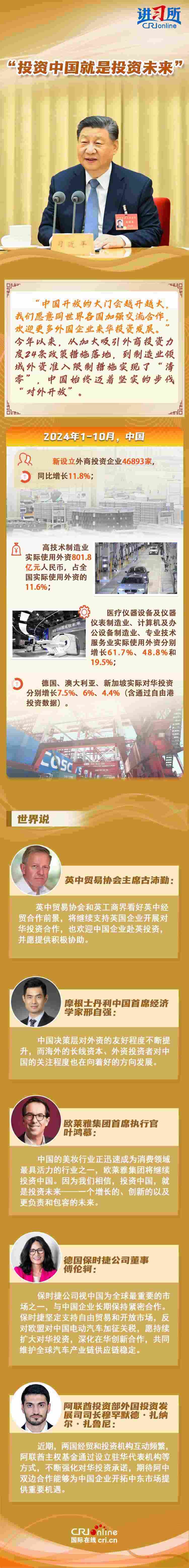 “中國(guó)是實(shí)干家、行動(dòng)派?!苯衲暌詠?lái),從習(xí)近平主席的歐洲之行到拉美之行,再到四天前在北京會(huì)見(jiàn)主要國(guó)際經(jīng)濟(jì)組織負(fù)責(zé)人,習(xí)近平一直強(qiáng)調(diào),中國(guó)的發(fā)展將給世界帶來(lái)巨大機(jī)遇。據(jù)聯(lián)合國(guó)貿(mào)易和發(fā)展會(huì)議不久前發(fā)布的《世界投資報(bào)告2024》中文版顯示,中國(guó)吸引外資的結(jié)構(gòu)不斷優(yōu)化、質(zhì)量不斷提高,多位政商界人士也認(rèn)為中國(guó)是一個(gè)非常有前景的市場(chǎng),投資中國(guó)就是投資未來(lái)。