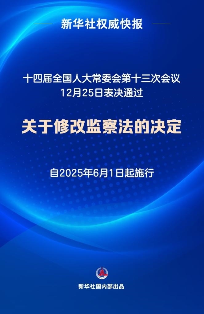 12月25日,十四屆全國人大常委會(huì)第十三次會(huì)議表決通過關(guān)于修改監(jiān)察法的決定,自2025年6月1日起施行。