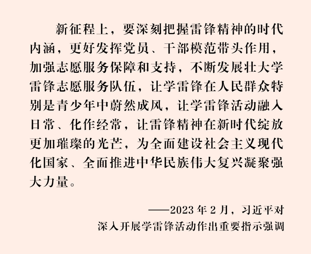 “實(shí)踐證明,無論時(shí)代如何變遷,雷鋒精神永不過時(shí)?!秉h的十八大以來,習(xí)近平總書記在多個(gè)場合發(fā)表講話、作出指示,深刻闡明雷鋒精神的永恒價(jià)值,明確要求發(fā)展壯大學(xué)雷鋒志愿服務(wù)隊(duì)伍,為新時(shí)代更好弘揚(yáng)雷鋒精神提供了根本遵循。
