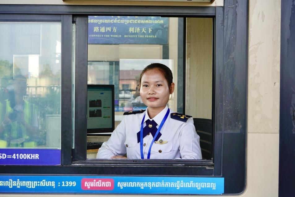 金港高速一處收費(fèi)站里,工作人員為往來車輛提供服務(wù)。(柬埔寨金港高速公路有限公司供圖)
