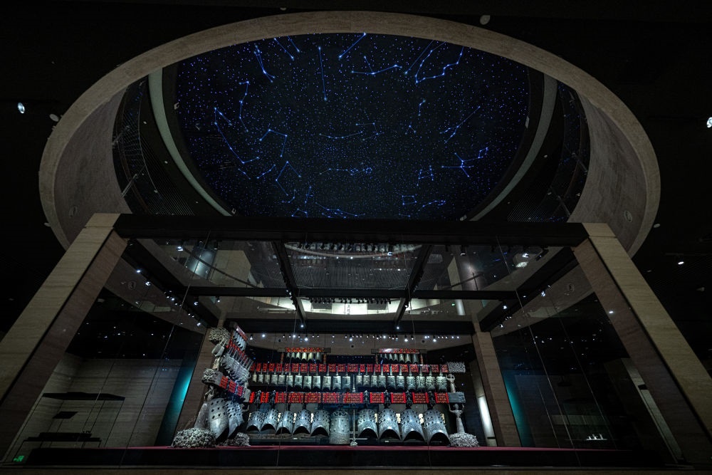 在湖北省博物館拍攝的隨州曾侯乙編鐘(2025年4月17日攝)。曾侯乙編鐘是我國出土數(shù)量最多、重量最重、音律最全、氣勢最為宏偉的一套編鐘,編鐘上的銘文是目前已知唯一的中國先秦官方音樂理論文獻(xiàn),以聲音和文字相互印證的方式保存了2400多年前人類的音樂記憶。