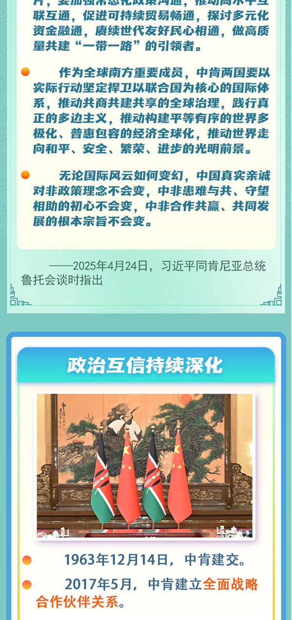 中肯友誼源于古老的海上絲綢之路。新時(shí)代以來(lái)中肯兩國(guó)高層交往密切,政治互信持續(xù)深化。肯尼亞各界認(rèn)為,肯中合作秉持共同愿景,非洲國(guó)家應(yīng)充分發(fā)揮非中合作潛力,攜手建設(shè)更加公平公正、多元繁榮的世界。