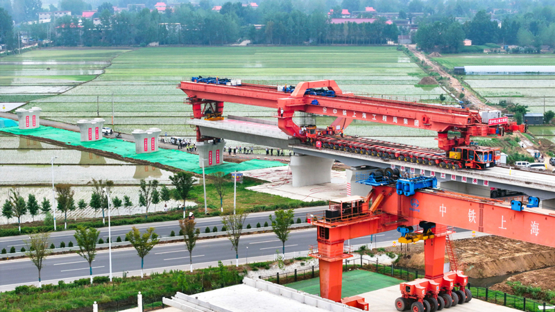 6月21日,在濰宿高鐵郯城沭河特大橋施工現(xiàn)場(chǎng),中鐵上海局工作人員在進(jìn)行箱梁架設(shè)(無(wú)人機(jī)照片)。