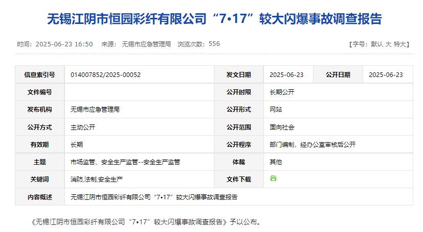 2024年7月17日12時56分許,位于江蘇省江陰市徐霞客鎮(zhèn)環(huán)鎮(zhèn)北路7號的江陰市恒園彩纖有限公司發(fā)生一起閃爆事故,造成5人死亡,11人受傷,直接經濟損失1528.3萬元。近日,無錫市應急管理局公布了該起事故的調查報告。