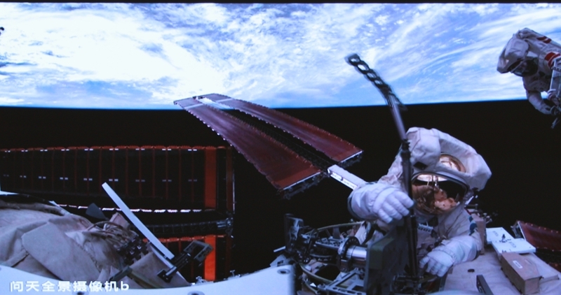 這是6月26日在北京航天飛行控制中心屏幕上拍攝的神舟二十號(hào)航天員陳中瑞在空間站組合體艙外工作的畫面。新華社發(fā)(周柯毅 攝)