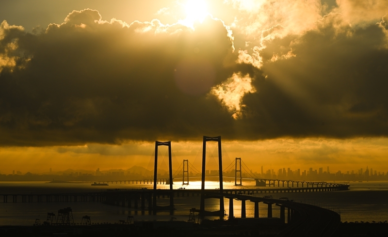 珠江口伶仃洋上,深中通道沐浴在晨曦之中,長(zhǎng)虹臥波、美不勝收。
