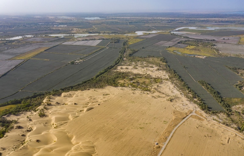 在新疆尉犁縣境內的塔里木河南岸防沙治沙區(qū)拍攝的羅布麻種植區(qū)(右下)、治理之前自然形成的沙丘(左下)、塔里木河及周圍綠洲(上)(無人機照片,9月20日攝)。