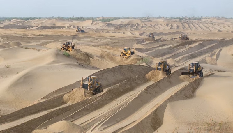 5月22日,在新疆尉犁縣境內的塔里木河南岸防沙治沙區(qū),大型機械在平整沙丘(無人機照片)。