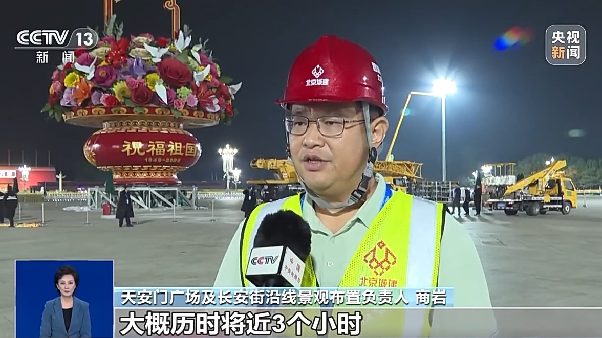 天安門(mén)廣場(chǎng)及長(zhǎng)安街沿線景觀布置負(fù)責(zé)人 商巖:從吊裝準(zhǔn)備工作開(kāi)始,一直到吊裝完成,大概歷時(shí)將近3個(gè)小時(shí)。保證籃盤(pán)和籃體的緊密結(jié)合,因?yàn)榛ɑ@在插置的過(guò)程中有一個(gè)觀賞角度,所以在吊裝和合龍整個(gè)過(guò)程當(dāng)中,四面相應(yīng)的觀賞面都要有工作人員要盯著,這個(gè)面不能有任何的變化。