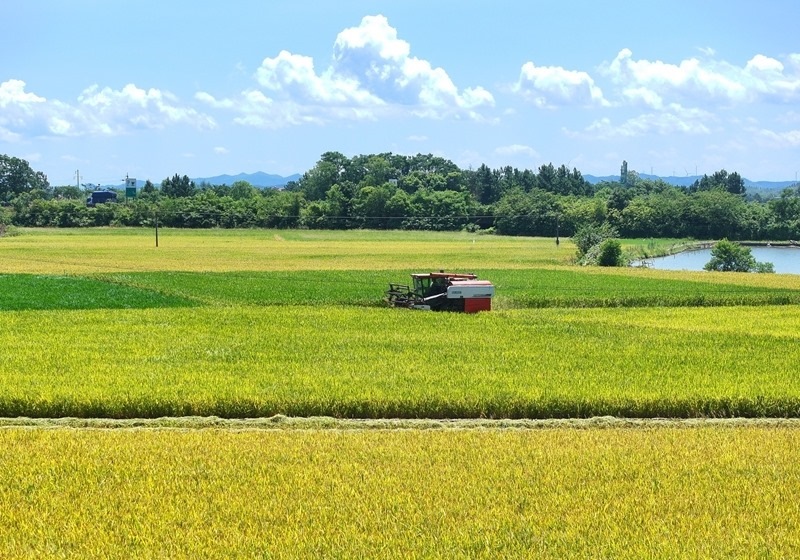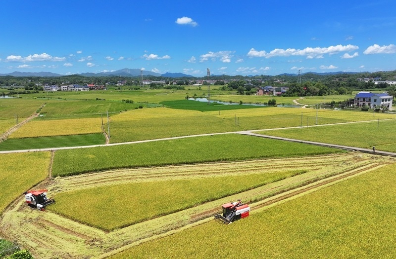 7月3日,在湖南省衡陽市衡山縣白果鎮(zhèn),村民駕駛收割機收割早稻(無人機照片)。