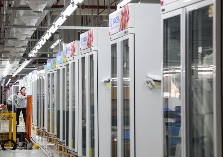 這是在西科冷鏈廣東江門(mén)制造基地的產(chǎn)線上,工人對(duì)一批出口海外的商用冷柜進(jìn)行外觀檢查(2025年3月22日攝)。新華社記者 劉大偉 攝