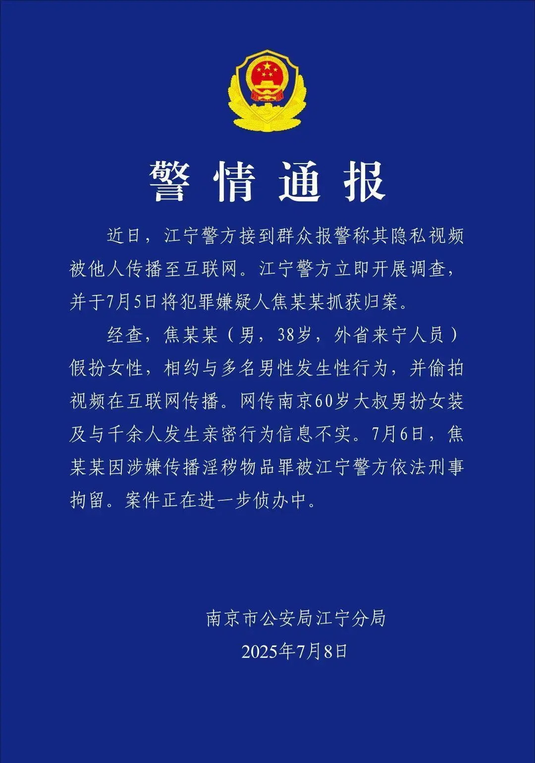 7月8日,南京江寧警方發(fā)布通報稱,焦某某(男,38歲,外省來寧人員)假扮女性,相約與多名男性發(fā)生性行為,并偷拍視頻在互聯網傳播。網傳南京60歲大叔男扮女裝及與千余人發(fā)生親密行為信息不實。目前,焦某某因涉嫌傳播淫穢物品罪被江寧警方依法刑事拘留。案件正在進一步偵辦中。