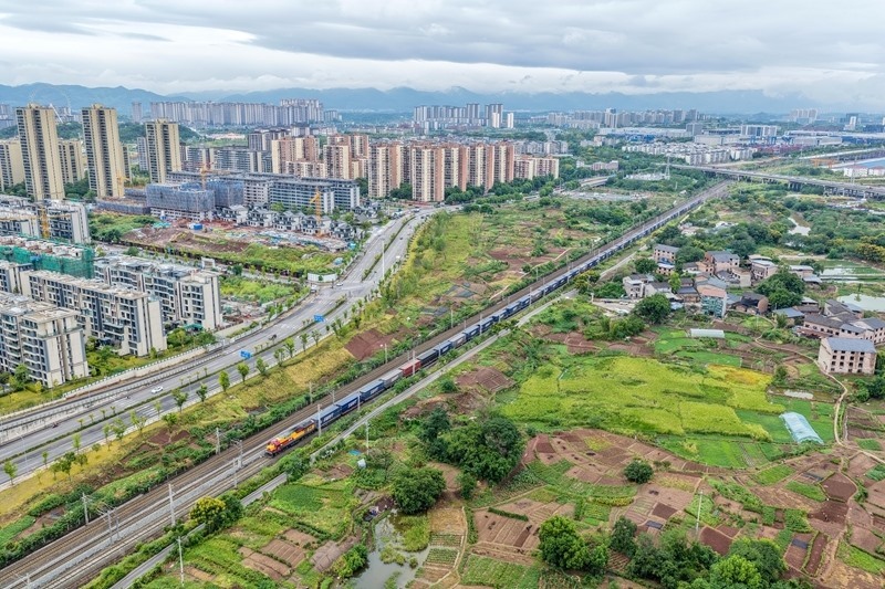 9月8日,滿載“重慶造”汽車的中歐班列(成渝)在重慶團(tuán)結(jié)村中心站順利發(fā)車(無人機(jī)照片)。