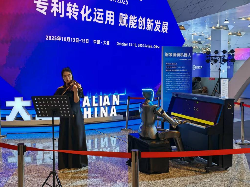 走進(jìn)一樓的展示大廳,一段優(yōu)美的音樂旋律緩緩流入耳中,一臺(tái)人形機(jī)器人指尖輕快地在鋼琴鍵盤上飛舞,和一名小提琴演奏家共同奏響《我和我的祖國》,引來許多與會(huì)嘉賓駐足聆聽。