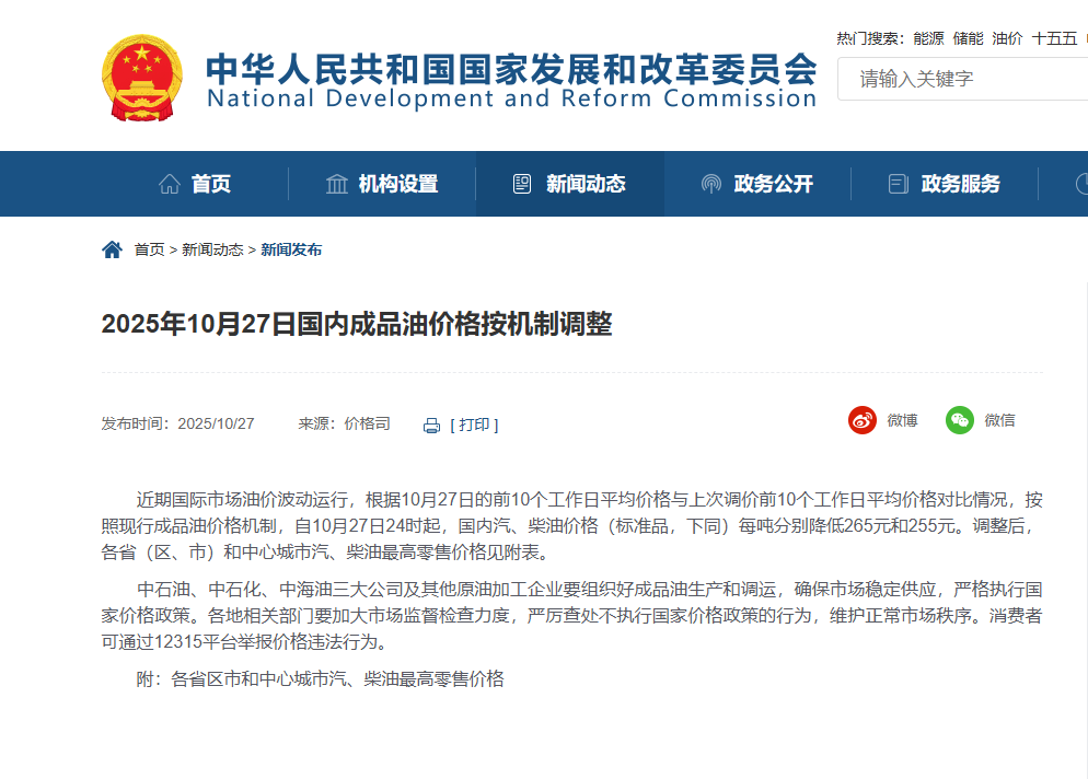 中國網(wǎng)10月27日訊 據(jù)國家發(fā)改委網(wǎng)站消息,近期國際市場油價(jià)波動(dòng)運(yùn)行,根據(jù)10月27日的前10個(gè)工作日平均價(jià)格與上次調(diào)價(jià)前10個(gè)工作日平均價(jià)格對(duì)比情況,按照現(xiàn)行成品油價(jià)格機(jī)制,自10月27日24時(shí)起,國內(nèi)汽、柴油價(jià)格(標(biāo)準(zhǔn)品,下同)每噸分別降低265元和255元。調(diào)整后,各?。▍^(qū)、市)和中心城市汽、柴油最高零售價(jià)格見附表。