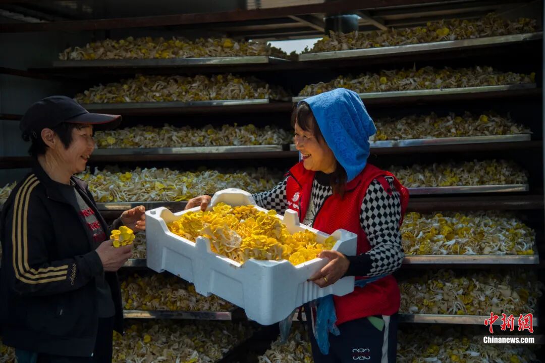 (菌菇烘干房內,菌農(nóng)正在勞作。黃松甸鎮(zhèn)供圖)