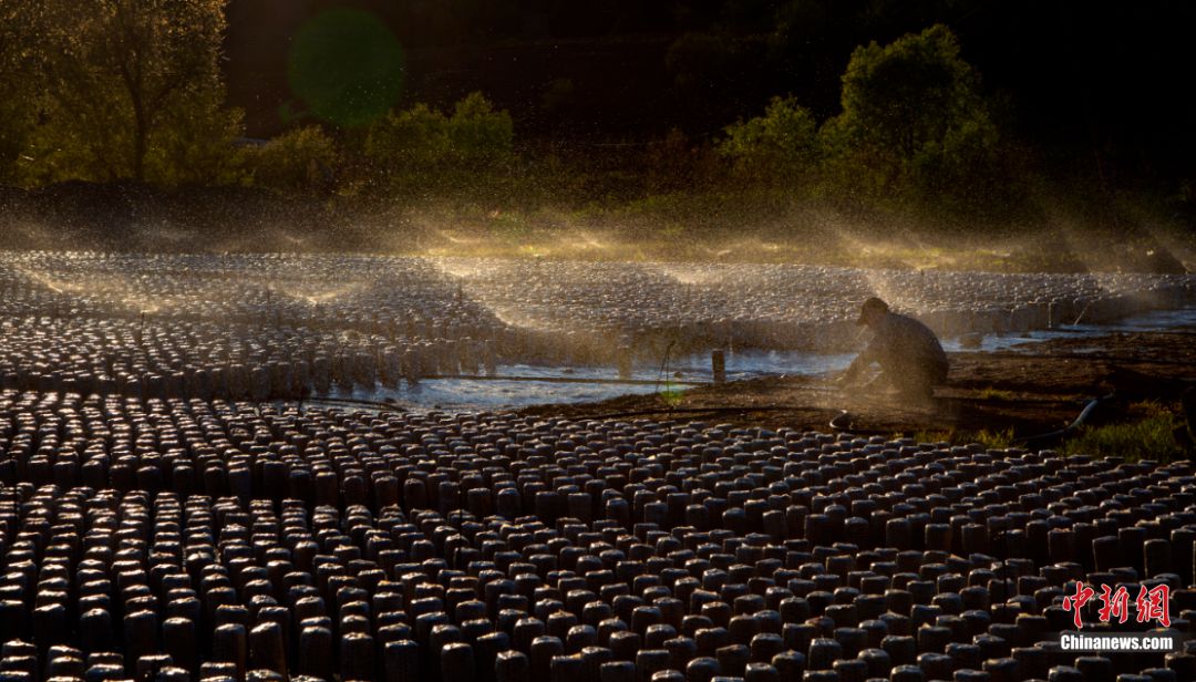 (夕陽下,菌農(nóng)們正在采摘。黃松甸鎮(zhèn)供圖)