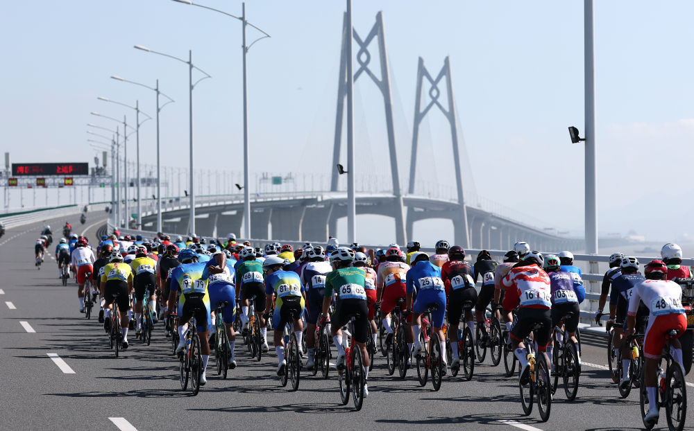 11月8日,參賽選手在港珠澳大橋騎行。當(dāng)日進(jìn)行的第十五屆全國(guó)運(yùn)動(dòng)會(huì)公路自行車男子個(gè)人賽,賽道全程231.8公里,選手經(jīng)過(guò)港珠澳大橋,跨越粵港澳三地。這是全運(yùn)會(huì)歷史上首次舉辦跨境比賽。新華社記者 毛思倩 攝