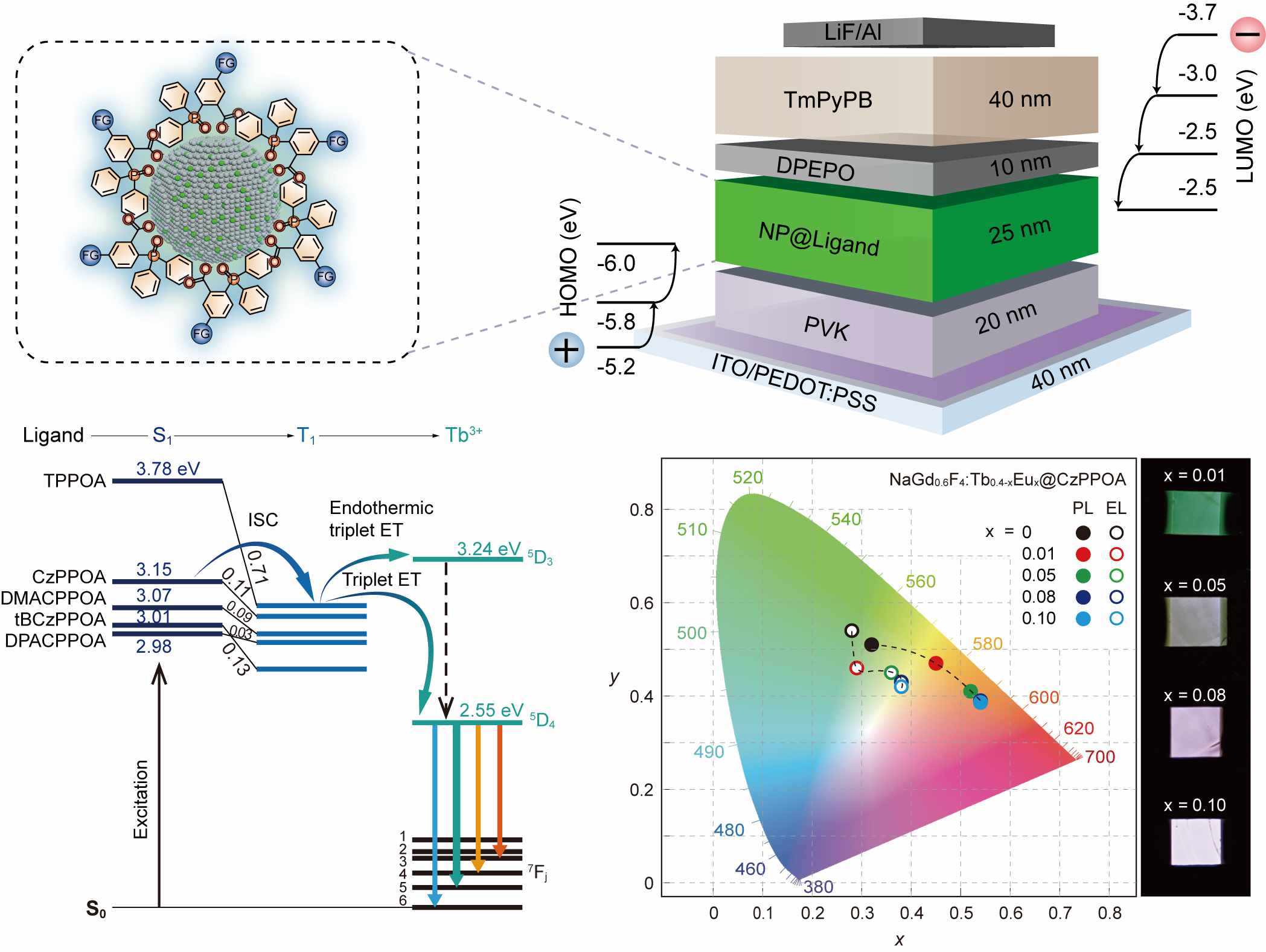 面對這一制約稀土材料邁向高端應用的瓶頸,研究團隊開創(chuàng)性地提出有機半導體敏化策略,以功能化有機配體作為“光電橋梁”,成功將能量精準高效地傳遞給絕緣稀土納米晶,實現(xiàn)了電流驅(qū)動下的高效發(fā)光。