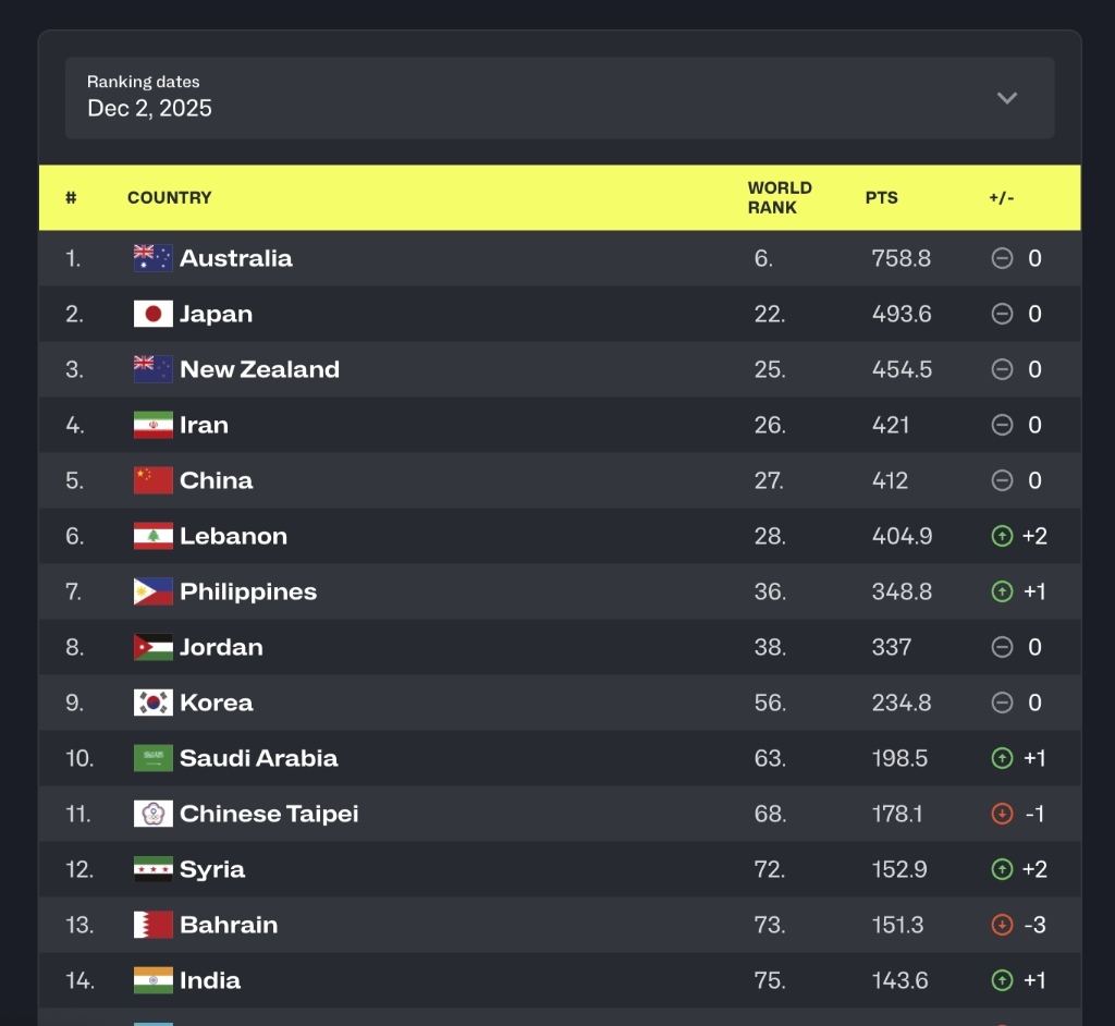 亞洲球隊(duì)中,排名最高的仍然是澳大利亞隊(duì)(世界排名第六),其次分別為日本隊(duì)、新西蘭隊(duì)和伊朗隊(duì),中國隊(duì)位列亞洲區(qū)第五。
