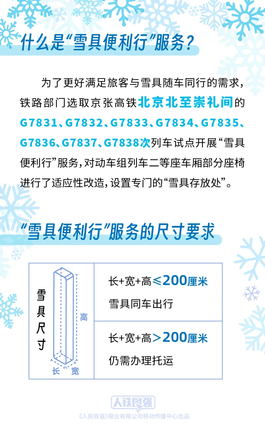 鐵路部門堅持以人民為中心的發(fā)展思想,持續(xù)深化運輸供給側(cè)結(jié)構(gòu)性改革,積極適應(yīng)旅客多樣化的出行需求,為攜帶雪具出行的旅客提供便捷服務(wù)。前期,鐵路部門按照《國鐵集團(tuán)鐵路旅客運輸規(guī)程》“旅客乘坐動車組列車隨身攜帶的行李物品長、寬、高之和不超過130厘米”的規(guī)定,對超過上述尺寸標(biāo)準(zhǔn)的雪具推出了“雪具快運”服務(wù)。為了更好滿足旅客與雪具隨車同行的需求,鐵路部門統(tǒng)籌考慮旅客安全、乘車秩序和雪具運輸需求,選取京張高鐵北京北至崇禮間的G7831、G7832、G7833、G7834、G7835、G7836、G7837、G7838次列車試點開展“雪具便利行”服務(wù),對動車組列車二等座車廂部分座椅進(jìn)行了適應(yīng)性改造,設(shè)置專門的“雪具存放處”,旅客選擇該服務(wù)后可攜帶長、寬、高之和不超過200厘米的雪具同車出行,滑雪更加方便快捷。對于長、寬、高之和超過200厘米的雪具,由于高鐵列車車內(nèi)空間限制,仍需辦理托運。