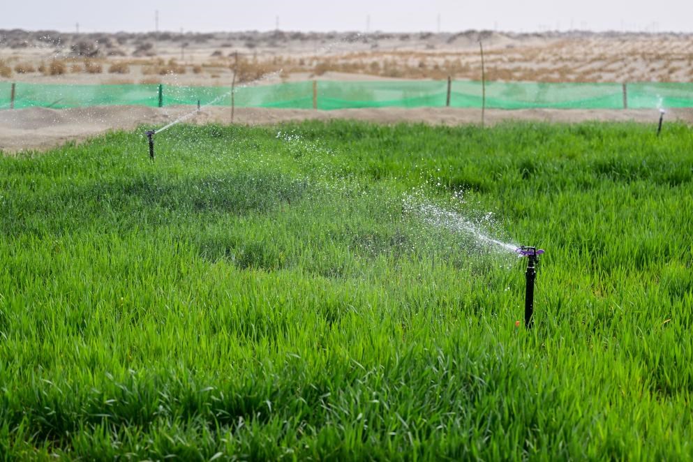 2025年4月13日,新疆阿克蘇地區(qū)沙雅縣沙生經(jīng)濟(jì)作物發(fā)展試驗(yàn)基地,經(jīng)過苦咸水淡化技術(shù)處理的地下水噴灌出的小麥長(zhǎng)勢(shì)良好。新華社記者丁磊 攝