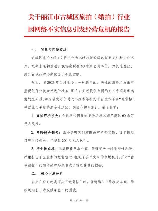 今年10月,麗江市古城區(qū)旅拍行業(yè)協(xié)會發(fā)布的《關于麗江市古城區(qū)旅拍(婚拍)行業(yè)因網(wǎng)絡不實信息引發(fā)經(jīng)營危機的報告》。