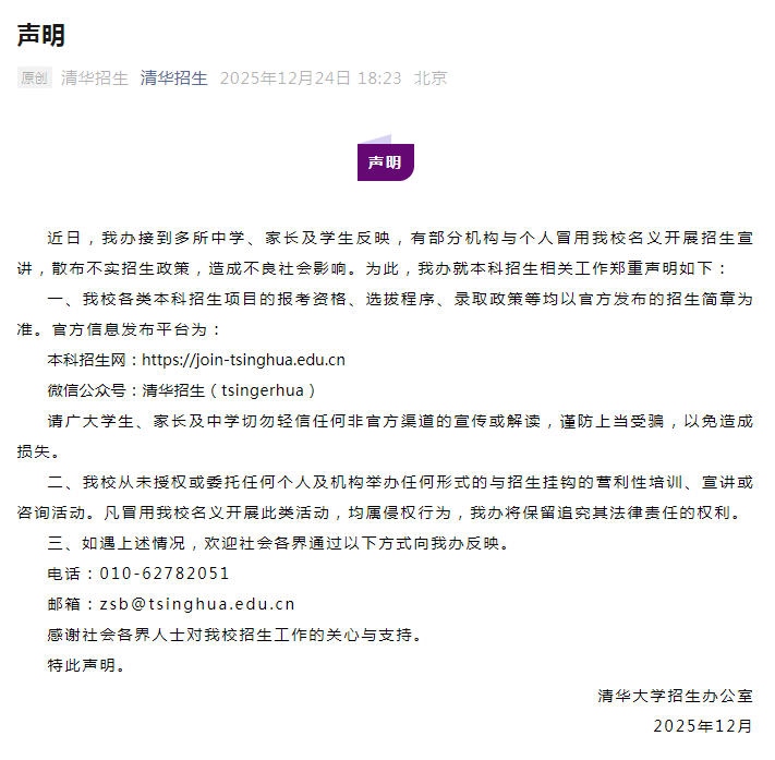 據(jù)“清華招生”微信公眾號(hào)消息,清華大學(xué)招生辦公室24日發(fā)布聲明稱,近日,清華大學(xué)招生辦公室接到多所中學(xué)、家長(zhǎng)及學(xué)生反映,有部分機(jī)構(gòu)與個(gè)人冒用清華大學(xué)名義開展招生宣講,散布不實(shí)招生政策,造成不良社會(huì)影響。為此,清華大學(xué)招生辦公室就本科招生相關(guān)工作鄭重聲明如下: