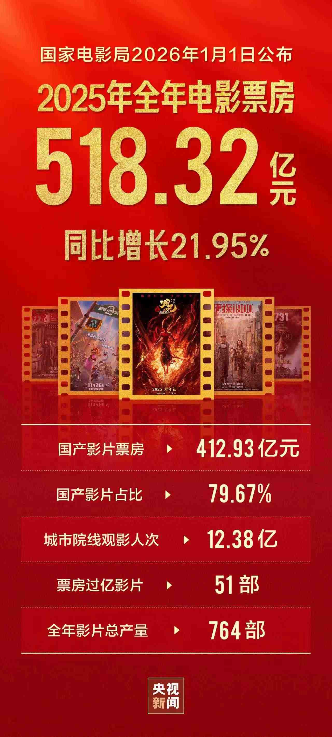 國家電影局2026年1月1日公布,2025年電影票房為518.32億元,同比增長21.95%,城市院線觀影人次為12.38億,同比增長為22.57%,國產影片票房為412.93億元,占比為79.67%。