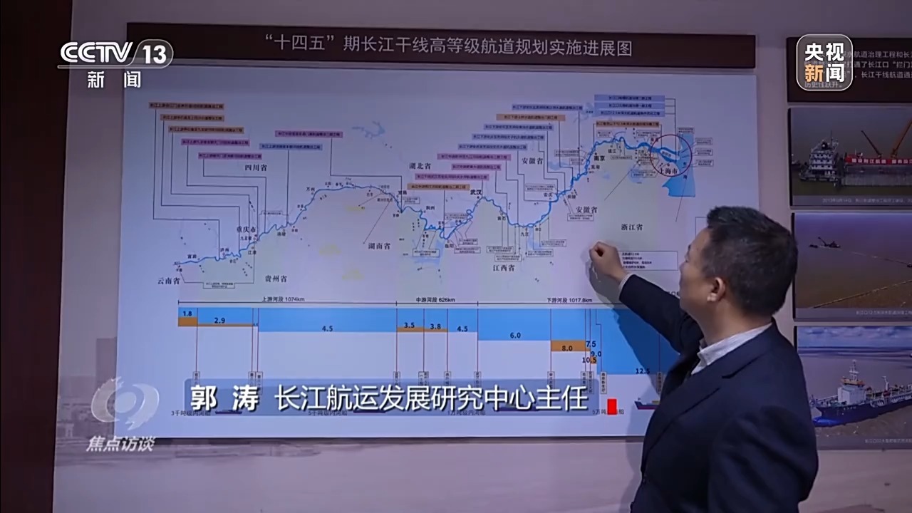 郭濤:十年前,因?yàn)榫植康亩曼c(diǎn)卡點(diǎn),航道標(biāo)準(zhǔn)不能統(tǒng)一,水深沒法貫通起來(lái)。通過(guò)十年的整治和疏浚,水深明顯提升了,可以通航的船舶更大了,物流成本就更低了。