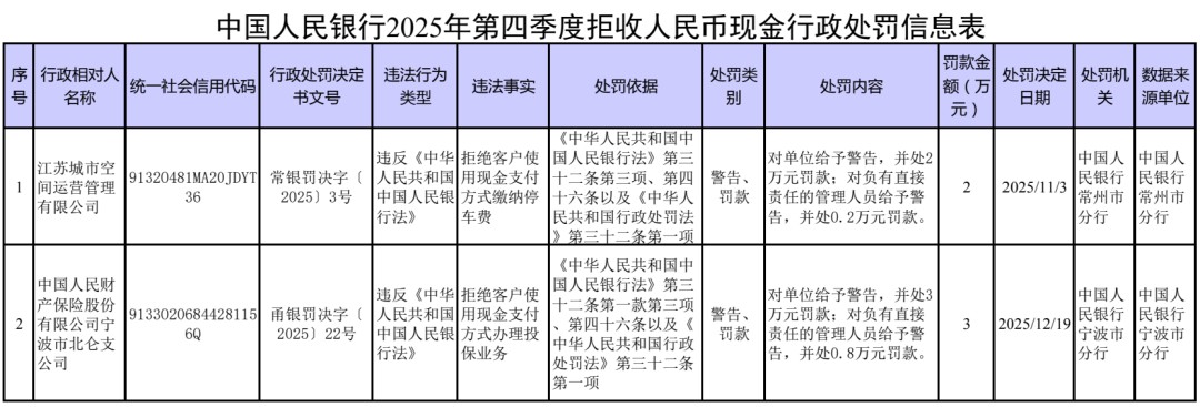 據(jù)中國(guó)人民銀行微信公眾號(hào)消息,2025年第四季度,中國(guó)人民銀行對(duì)2家核實(shí)為拒收人民幣現(xiàn)金的單位及相關(guān)責(zé)任人依法作出經(jīng)濟(jì)處罰。廣大經(jīng)營(yíng)主體應(yīng)強(qiáng)化法治觀(guān)念,尊重公眾支付選擇權(quán),共同打造和諧現(xiàn)金流通環(huán)境。