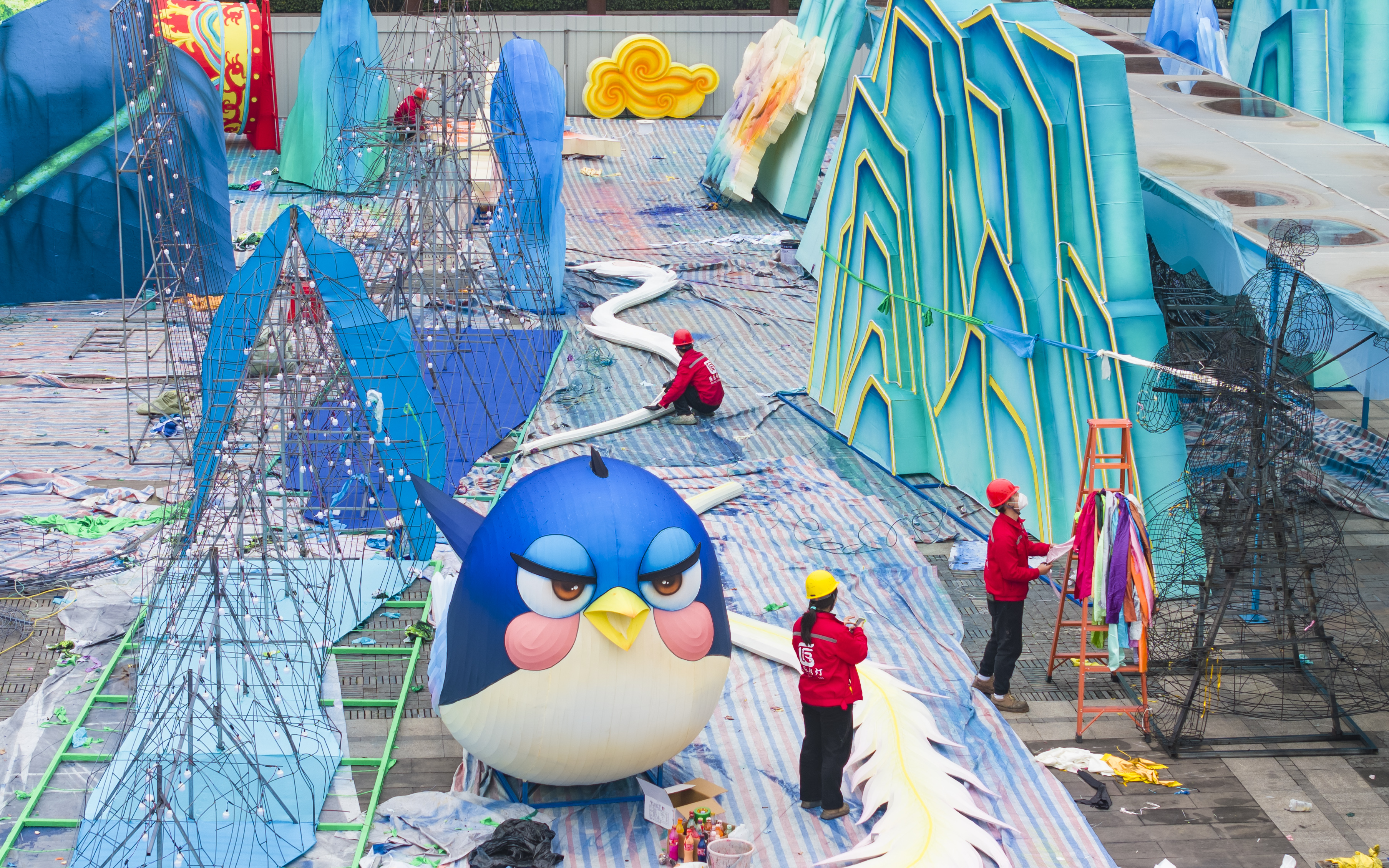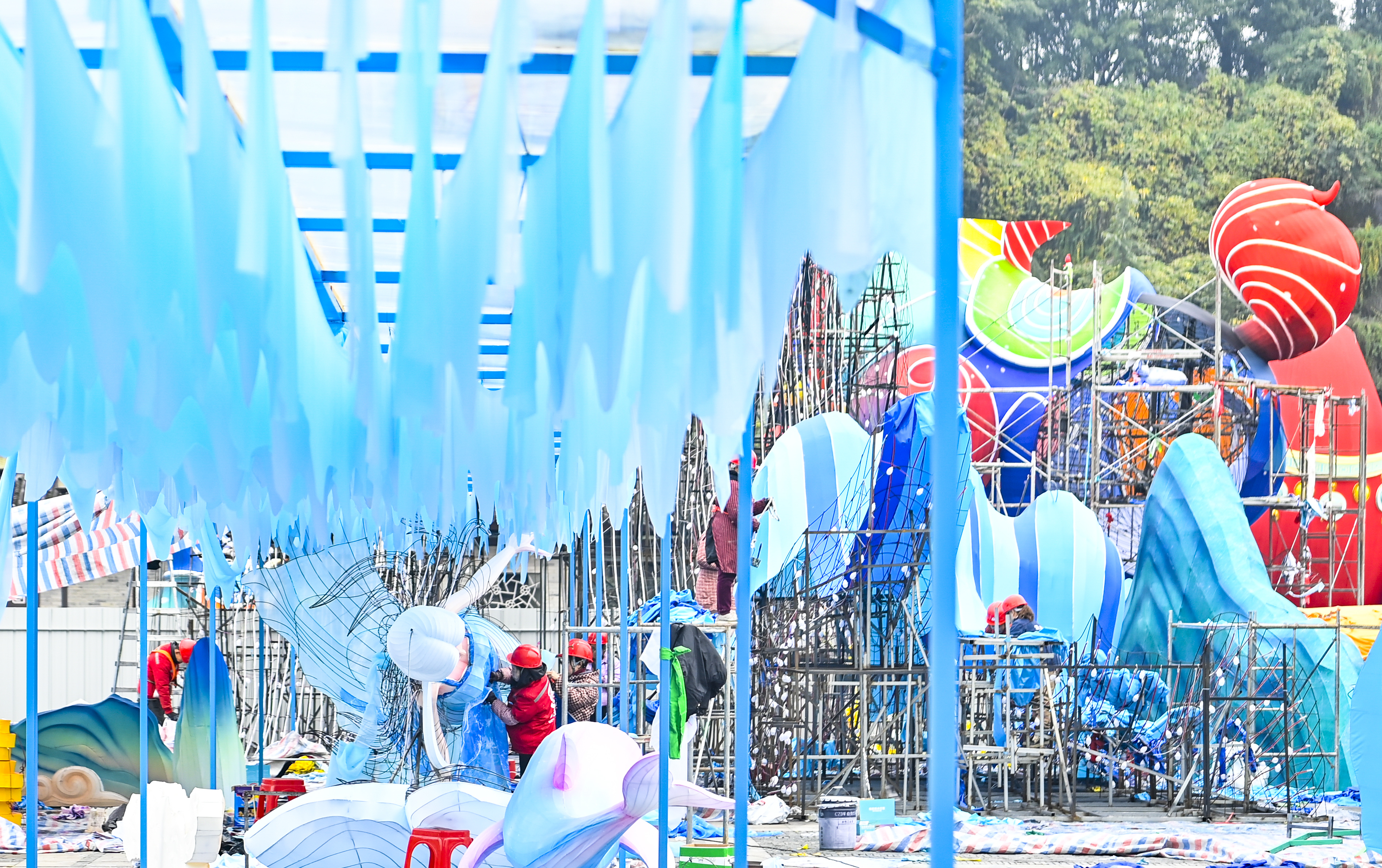 ▲2026重慶市新春燈會(huì)——“禧歡霓”園博園大型水上燈會(huì)現(xiàn)場,工人正加緊搭建各種造型的彩燈。記者 齊嵐森 攝/視覺重慶