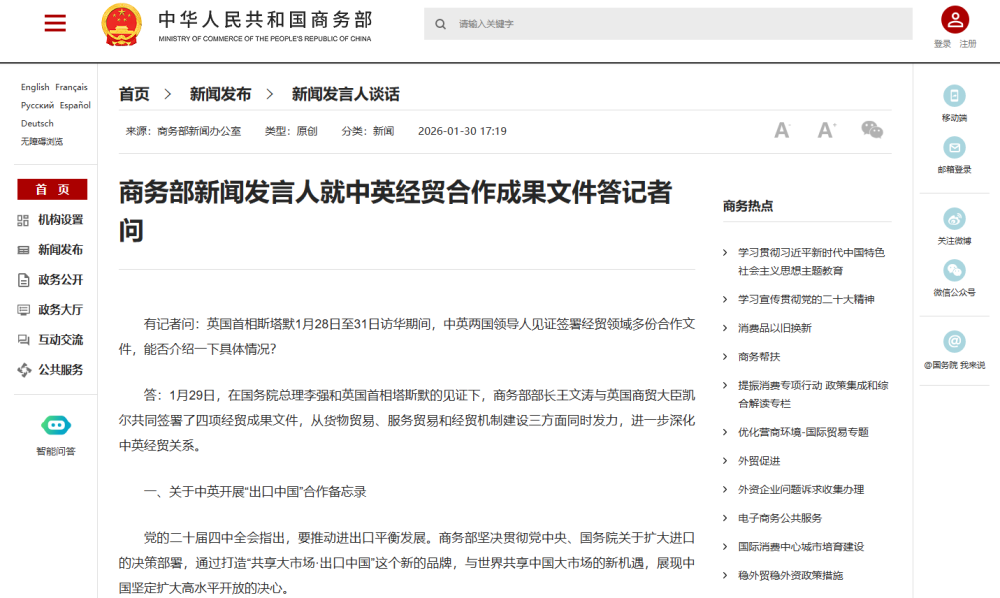 中國(guó)網(wǎng)1月30日訊 據(jù)商務(wù)部網(wǎng)站消息,商務(wù)部新聞發(fā)言人就中英經(jīng)貿(mào)合作成果文件答記者問(wèn)。