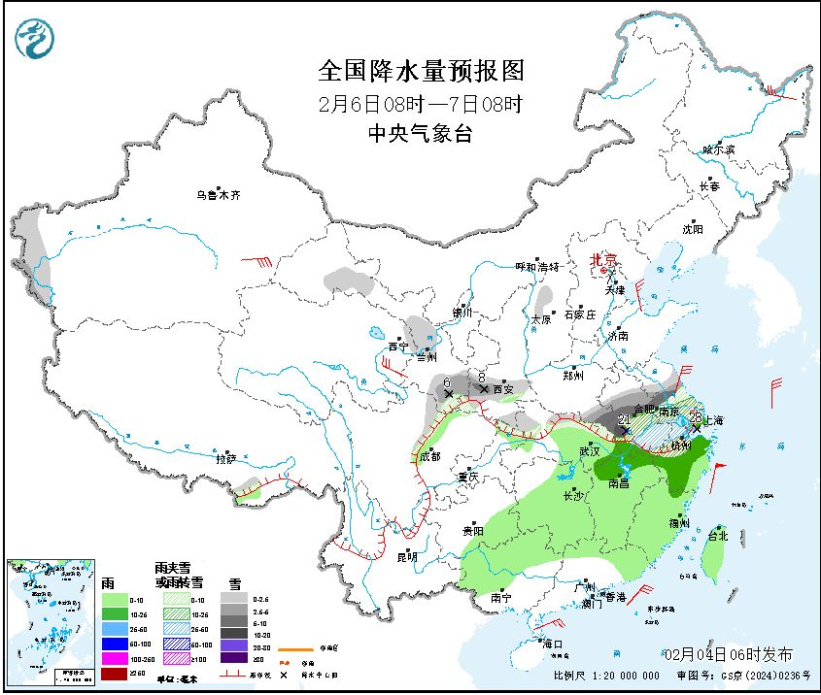 2月6日08時至7日08時,新疆南部、甘肅河西和中南部、陜西中南部、湖北北部、河南南部、安徽中南部、江蘇中南部、上海、浙江北部等地部分地區(qū)有小到中雪或雨夾雪,其中,陜西中部、河南南部、安徽中南部、江蘇中南部、浙江北部等地部分地區(qū)有大到暴雪或雨夾雪,安徽西南部局地大暴雪(20~21毫米)。江漢東部、江南大部、重慶東北部、華南北部、廣西西南部、廣東東南部、臺灣島等地部分地區(qū)有小到中雨,其中,浙江北部等地部分地區(qū)有大雨(25~28毫米)。黑龍江東北部、青海東部、新疆南疆盆地等地部分地區(qū)有4~6級風,陣風6~7級,東海大部、臺灣海峽將有6~8級風、陣風9級,黃海中部和南部、臺灣以東洋面、南海東北部將有5~7級風、陣風8級。