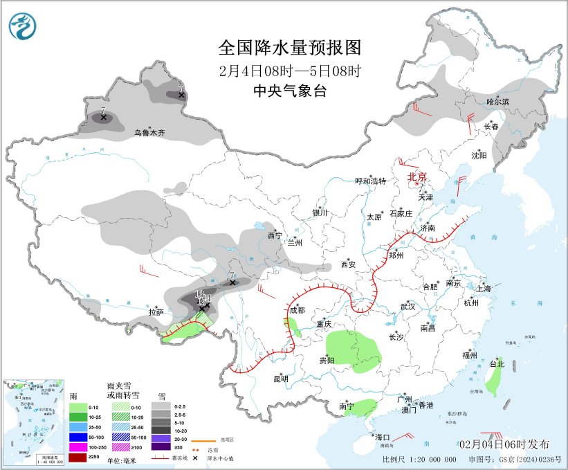 2月4日08時至5日08時,內蒙古東北部、東北地區(qū)中東部、新疆北疆大部和南疆盆地東南部、西藏南部和東部、青海中南部、甘肅南部等地部分地區(qū)有小雪或雨夾雪,其中,新疆北疆東部和伊犁河谷、西藏東部等地部分地區(qū)有中到大雪,局地暴雪(10~15毫米)。四川盆地西南部、貴州東部、湖南西部、廣西東南部、廣東西南部、臺灣島大部等地部分地區(qū)有小雨。內蒙古東南部和中部、河北北部、西藏北部、川西高原北部等地部分地區(qū)有4~5級風,陣風6~7級,南海東北部將有5~7級風、陣風8級。