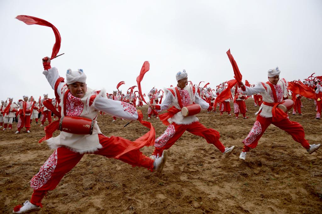 腰鼓手在陜西省延安市安塞區(qū)南溝村進(jìn)行一場(chǎng)山地腰鼓演出。新華社記者 劉瀟 攝