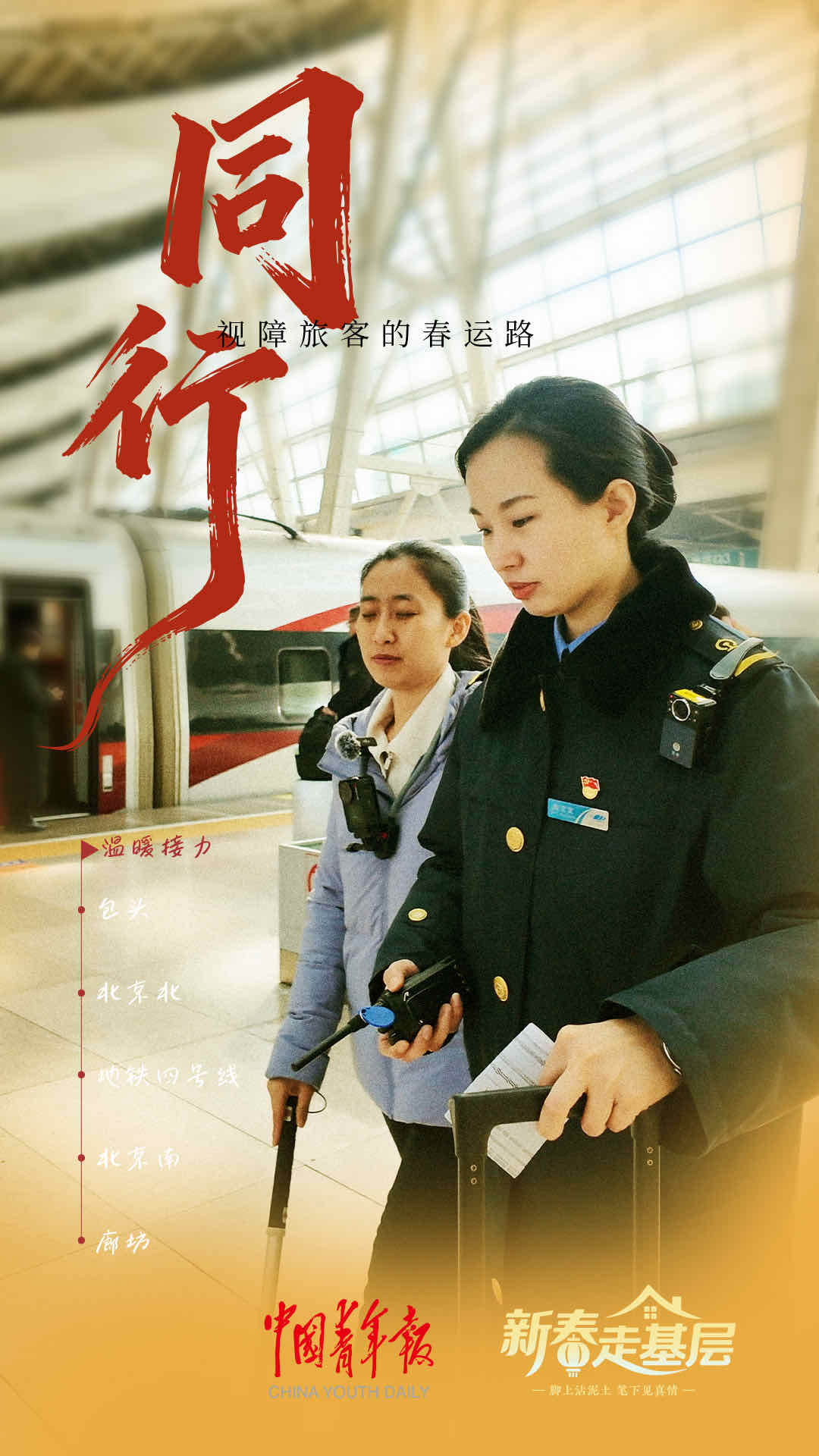 這一路,全程參與接力的鐵路、地鐵工作人員,有十余人。北京北站的工作人員說(shuō),春運(yùn)期間,日均服務(wù)重點(diǎn)旅客50至100人。