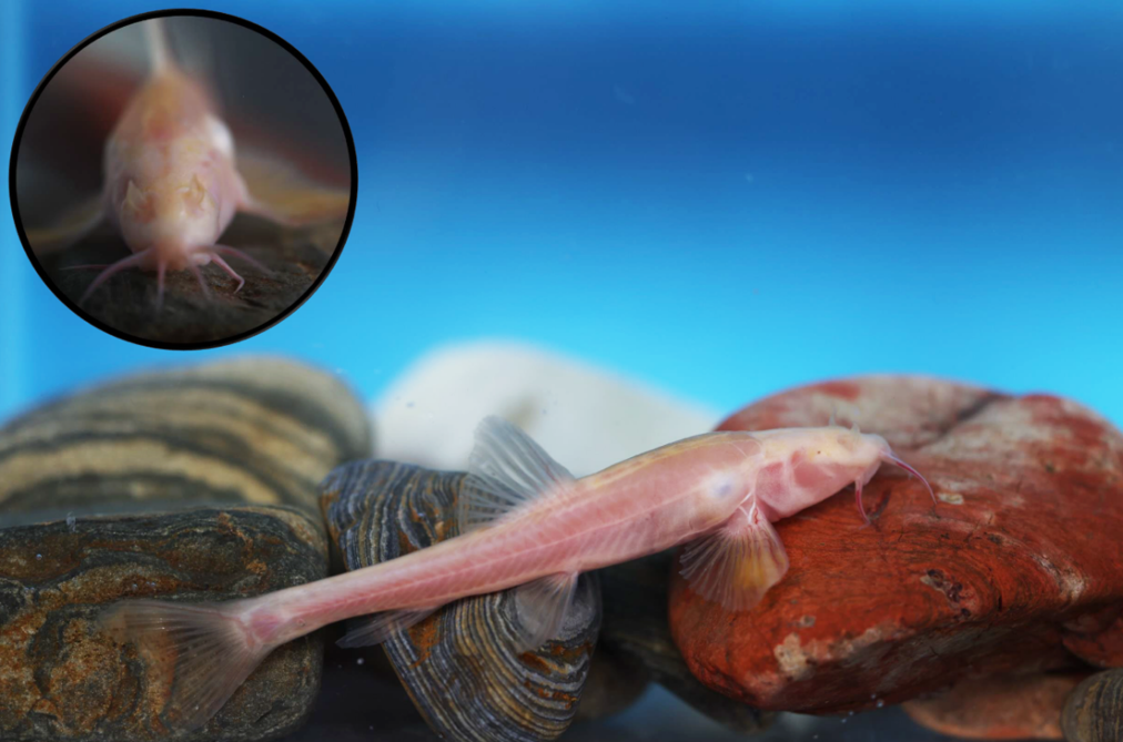 這是“納雍盲高原鰍”的活體圖,其身體呈現(xiàn)透明淡粉色,鱗片消失,眼睛退化為小黑點。(受訪者供圖)