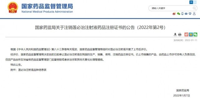 據(jù)國家藥監(jiān)局網(wǎng)站消息,國家藥品監(jiān)督管理局11日發(fā)布公告,決定自即日起停止蓮必治注射液在我國的生產(chǎn)、銷售、使用,注銷藥品注冊證書。已上市銷售的產(chǎn)品,由藥品上市許可持有人負(fù)責(zé)召回,召回產(chǎn)品由所在地省級藥品監(jiān)督管理部門監(jiān)督銷毀或者依法采取其他無害化處理等措施。
