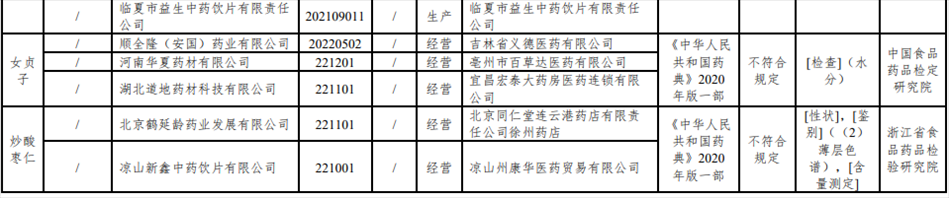 經(jīng)浙江省食品藥品檢驗(yàn)研究院檢驗(yàn),標(biāo)示為北京鶴延齡藥業(yè)發(fā)展有限公司、涼山新鑫中藥飲片有限公司生產(chǎn)的2批次炒酸棗仁不符合規(guī)定,不符合規(guī)定項(xiàng)目包括性狀、鑒別、含量測定。