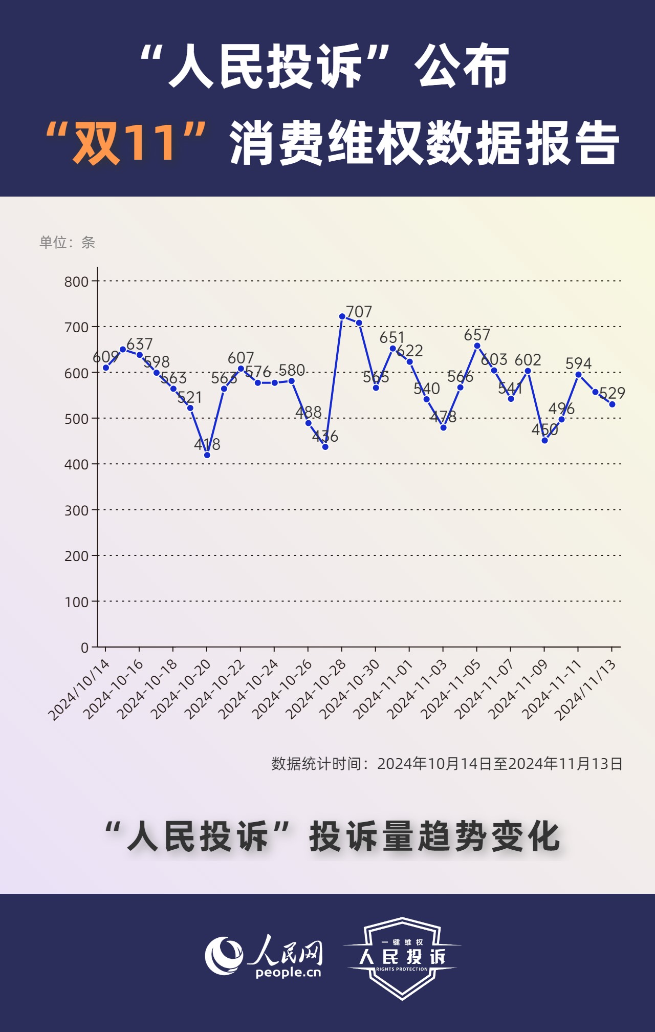 那么,今年你的“雙11”購物還遇到了哪些“套路”?據人民網“人民投訴”平臺統(tǒng)計,“雙11”期間平臺共收到17699條(數(shù)據統(tǒng)計從2024年10月14日-11月13日)投訴信息。其中,手機、家電、智能產品、美妝服飾等消費領域維權量大;平臺“國補”“以舊換新”等優(yōu)惠規(guī)則不透明,保價服務藏“貓膩”,直播間虛假“破價”,“百億補貼”商品貨不對板,“高價預售”欺詐等問題反映突出。