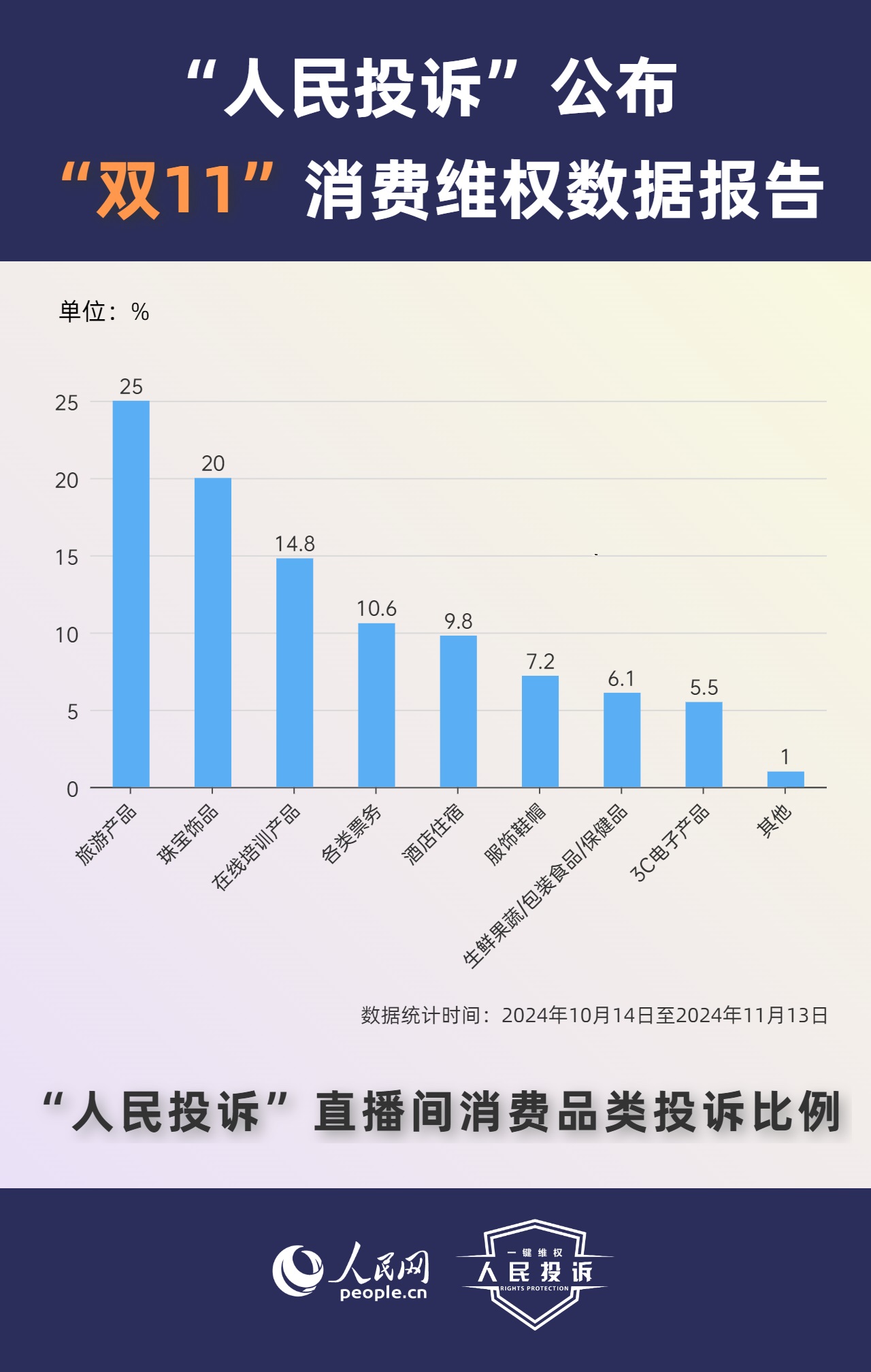 今年“雙11”前夕,人民網“人民投訴”平臺聯(lián)合人民日報“讀者來信”版發(fā)起規(guī)范“直播帶貨”問題建議征集活動。平臺數(shù)據顯示,活動上線以來,網友通過各渠道的相關留言量已超千條。“人民投訴”分析發(fā)現(xiàn),網友投訴直播消費多集中在預付費式旅游產品、在線培訓產品、珠寶飾品、服裝鞋帽、電子產品、生鮮食品、酒店服務、娛樂演出票務、寵物買賣等消費品類。其中,旅游套餐投訴占比25%,珠寶飾品交易投訴占比20%,在線培訓投訴占比14.8%,各類票務投訴占比10.6%,酒店住宿投訴占比9.8%,服飾帽類商品投訴占比7.2%,生鮮果蔬/包裝食品/保健品投訴占比6.1%,3C電子產品投訴占比5.5%。