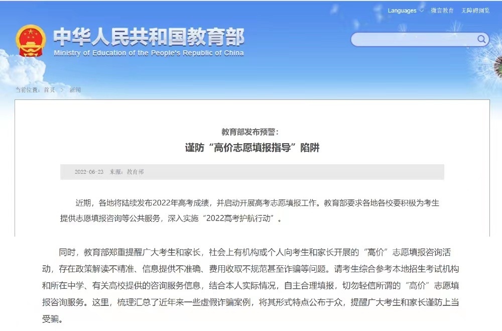 近日,教育部發(fā)布預(yù)警,提醒考生謹(jǐn)防“高價志愿填報指導(dǎo)”陷阱。有網(wǎng)站虛假宣傳擁有所謂“內(nèi)部信息”,自稱掌握內(nèi)部大數(shù)據(jù),能夠“精準(zhǔn)定位院?!钡鹊取J聦嵣?,每年高考填報志愿前,各省級招生考試機構(gòu)都會發(fā)布當(dāng)年高考成績統(tǒng)計情況和近年來各高校錄取分?jǐn)?shù)情況,并不存在市面上的咨詢機構(gòu)或個人聲稱的“內(nèi)部信息”。還有一些咨詢機構(gòu)假冒所謂志愿填報專家身份。該咨詢機構(gòu)打出廣告,稱團(tuán)隊的專家“獲得高考志愿規(guī)劃師認(rèn)證”“來自著名高校”等。事實上,有關(guān)部門從未發(fā)放過“高考志愿規(guī)劃師”這類職業(yè)資格證書。該機構(gòu)一些所謂“志愿規(guī)劃師”都是臨時招募的社會人員,按照總部提供的“臺詞”給考生和家長輔導(dǎo)。家長購買這些機構(gòu)的服務(wù)不僅花了冤枉錢,而且可能報錯志愿?! ?/p>
