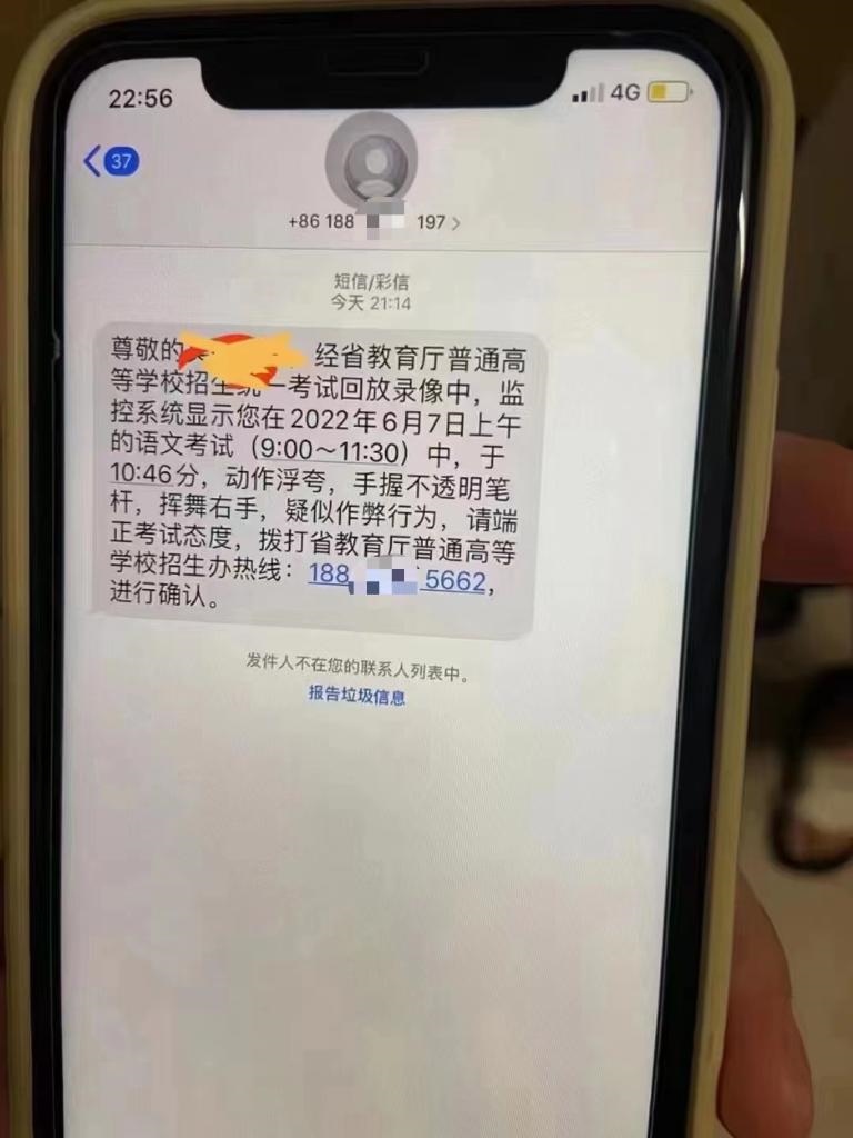 “尊敬的考生×××,經(jīng)省教育廳普通高等學(xué)校招生統(tǒng)一考試回放錄像中,監(jiān)控系統(tǒng)顯示您在2022年6月7日上午的語文考試(9:00—11:30)中,于10時46分,動作浮夸,手握不透明筆桿,揮舞右手,疑似作弊行為,請端正考試態(tài)度,撥打省教育廳普通高等學(xué)校招生辦熱線:188×××進(jìn)行確認(rèn)?!苯眨锌忌驈B門警方反映,自己接到了聲稱是“省教育廳普通高等學(xué)校招生辦”的通知短信,懷疑是詐騙信息。該短信在開頭準(zhǔn)確寫明了考生姓名,并在結(jié)尾要求考生主動撥電話號碼進(jìn)行確認(rèn)。經(jīng)與教育部門核實確認(rèn),高考作弊違規(guī)行為不會以短信、電話、鏈接等方式通知。廈門警方提醒,不法分子通過非正常渠道搜集到考生信息,并向考生發(fā)送所謂“疑似作弊”的通知短信,考生一旦回?fù)茈娫挘涂赡鼙徊环ǚ肿右浴疤幚碜鞅仔袨椤睘橛蓪嵤┰p騙?! ?/p>