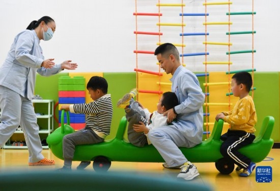 3月30日,在西安市金色陽光康復(fù)中心,特教老師為孩子進(jìn)行康復(fù)訓(xùn)練。