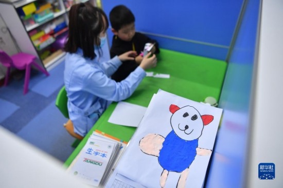 3月30日,在西安市金色陽光康復(fù)中心,特教老師指導(dǎo)孩子進(jìn)行繪畫練習(xí)。