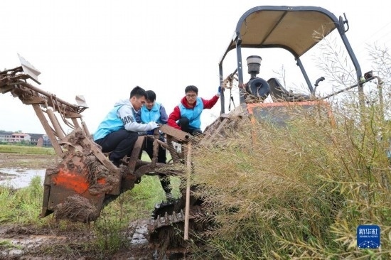 4月29日,在衡陽縣西渡鎮(zhèn)新橋村,南華大學的大學生志愿者在檢修農(nóng)機。