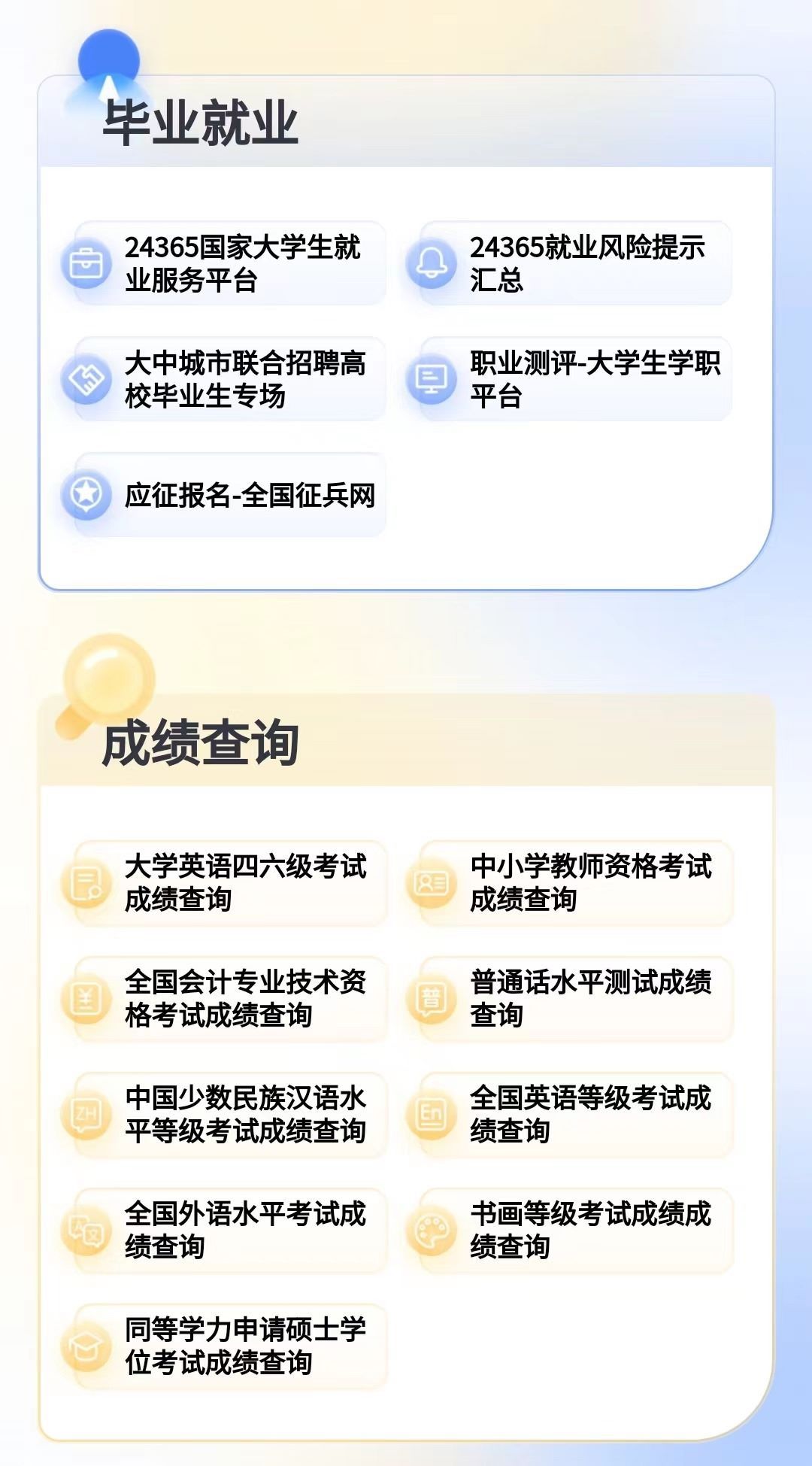 細(xì)分到大學(xué)生群體,“人民網(wǎng)+”客戶端便民服務(wù)匯總小程序提供在校期間多種國家考試成績的查詢服務(wù),并為大學(xué)生群體提供畢業(yè)就業(yè)資訊及服務(wù),實(shí)現(xiàn)從入學(xué)到就業(yè)“服務(wù)閉環(huán)”:
