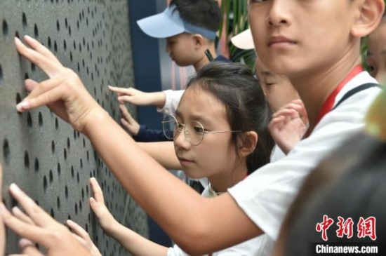 8月7日,學(xué)員用手觸摸國(guó)家大劇院內(nèi)的特色墻壁。中新社記者 李駿 攝